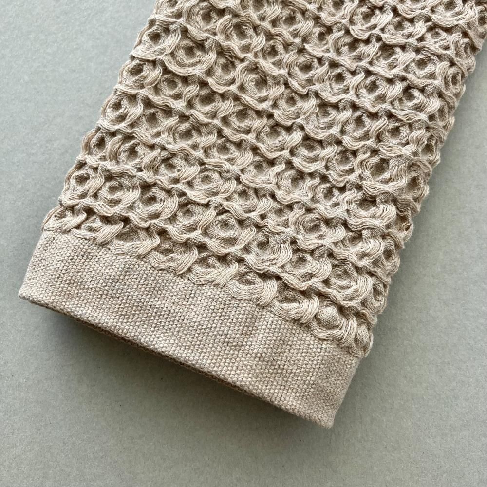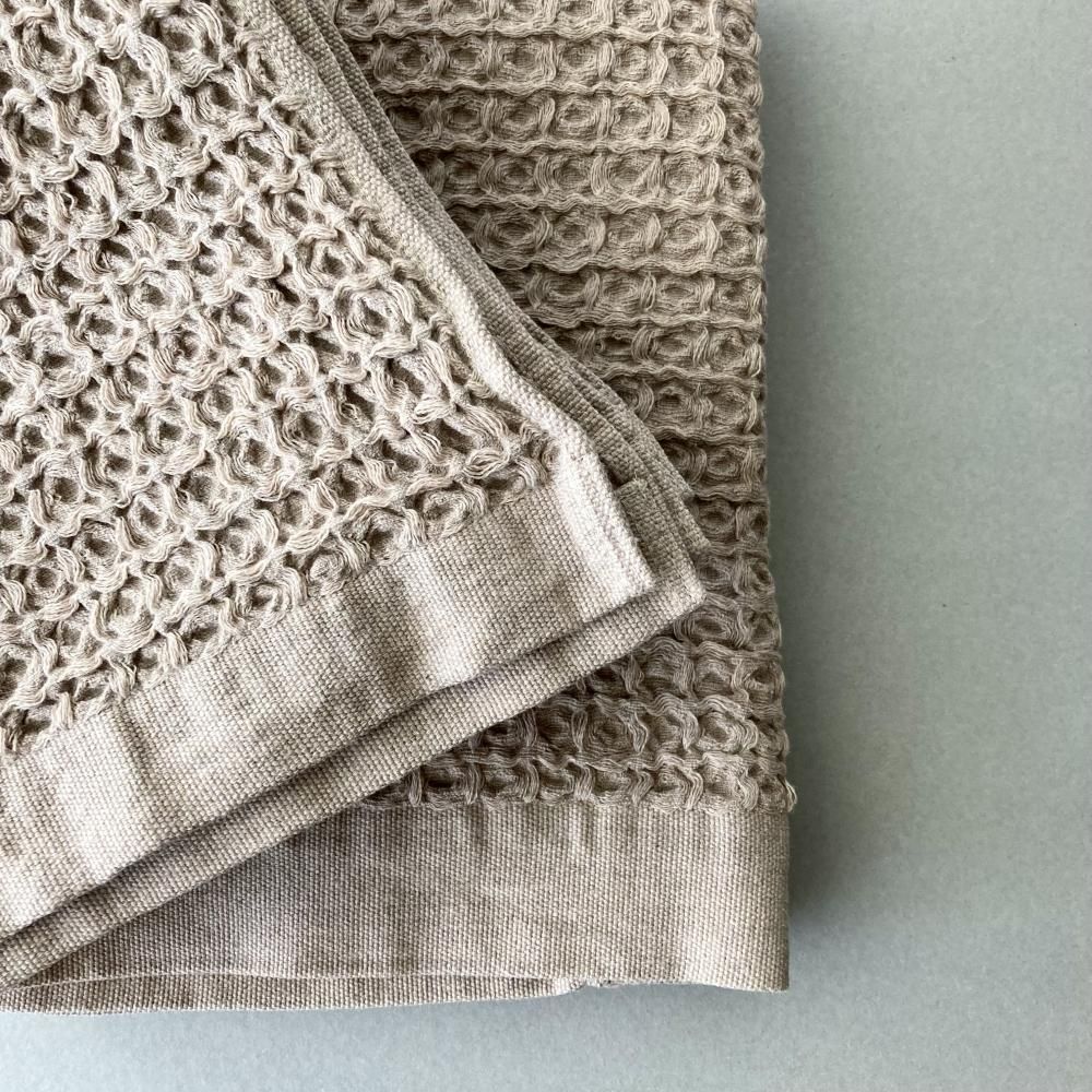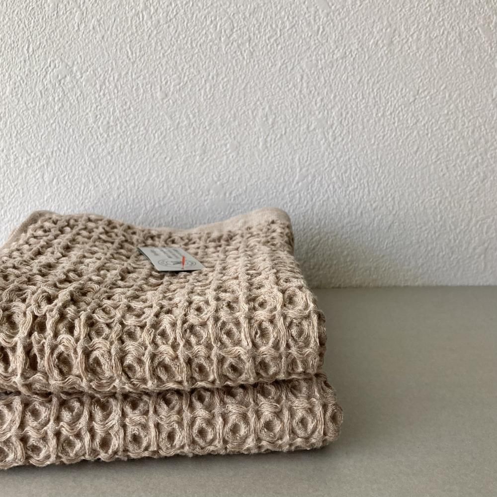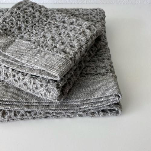 でこぼことした大きめのワッフルは、肌に触れる部分が少ないため、濡れてもべたつきません。 綿100%ですが、リネンのようにさっぱりとした拭き心地なので、汗ばむ季節にも快適に使えます。 両面がパイルのタオルよりも、乾きやすくかさばらないのでお洗濯も楽々。 使い始めの拭き心地が、長い間持続することもブレラが人気の理由の一つです。