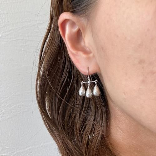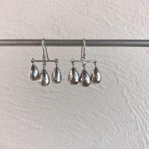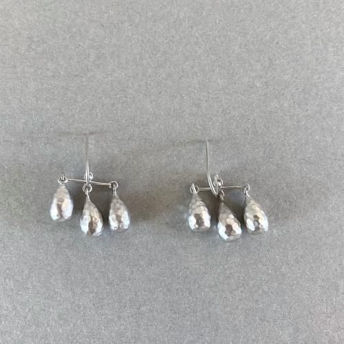 Water Collectionの中からDrizzle(霧雨)と名付けられたピアス。ドロップ型のチャームは板状のシルバーを成型し、ロウ付け(溶接)して作られているため、中空で見た目以上に軽い。打ち叩かれた独特のテクスチャーや有機的なフォルムは、プリミティブで彫刻作品のような魅力があると思う。インドならではの手仕事の魅力と、TEJらしいユニークな発想が融合したアイテム。