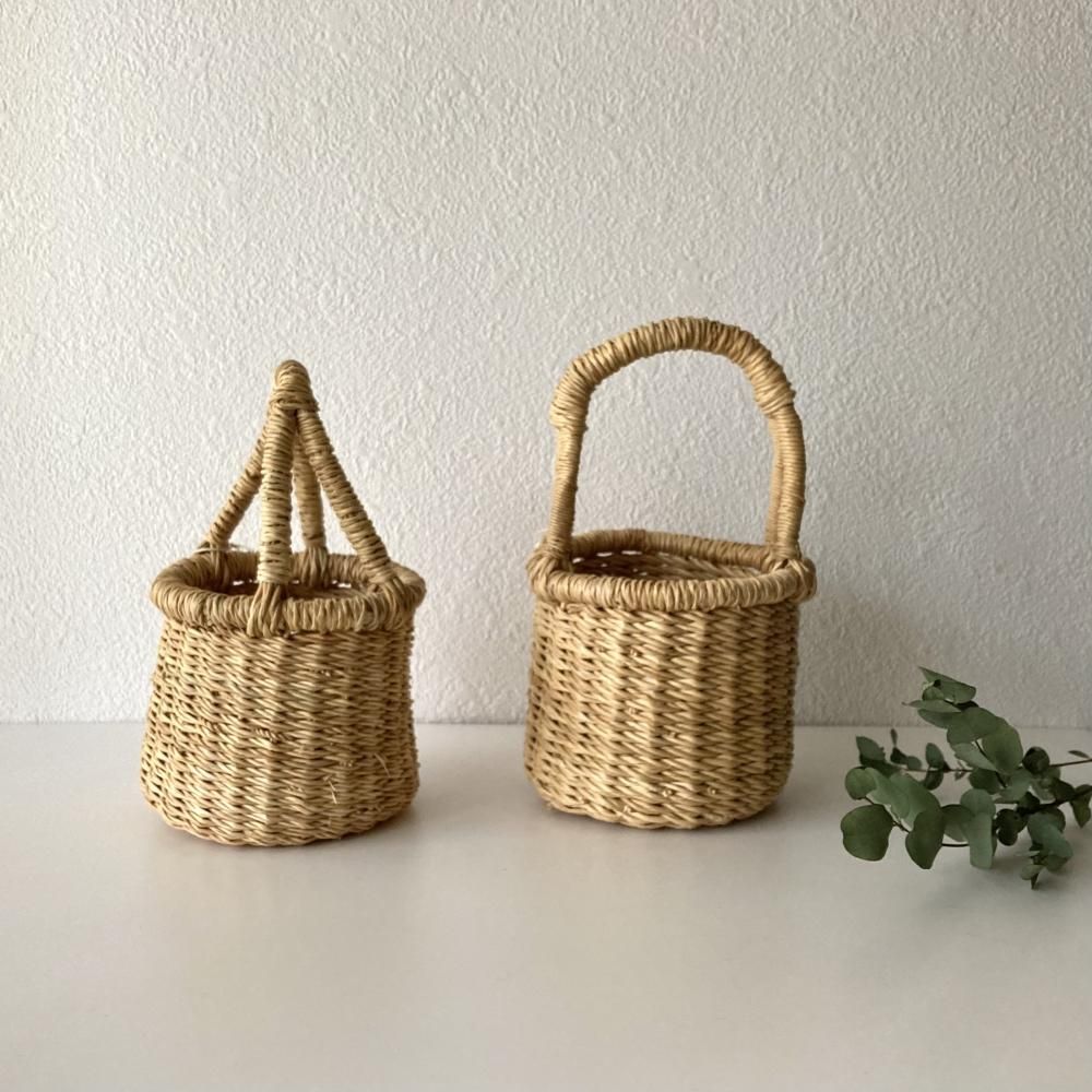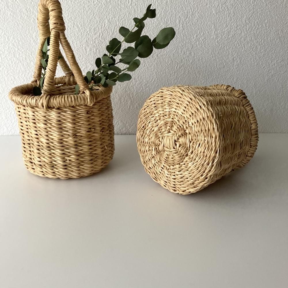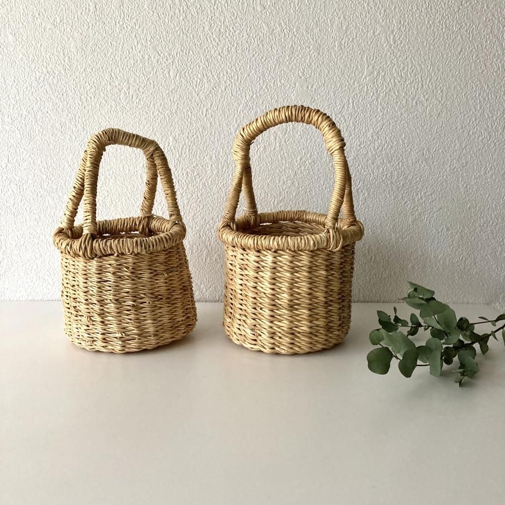 100%植物製のかごです。かたちは霧吹きなどで少し湿らせて整えることが可能です。保管する際は、変色しやすくなりますので直射日光や強い照明が近くに当たる場所などはお避け下さい。また、湿気はカビの原因になりますのでお気を付け下さい。手作り品のためサイズ・形にバラつきがあり、画像とは若干異なる場合がございます。あらかじめご了承ください。