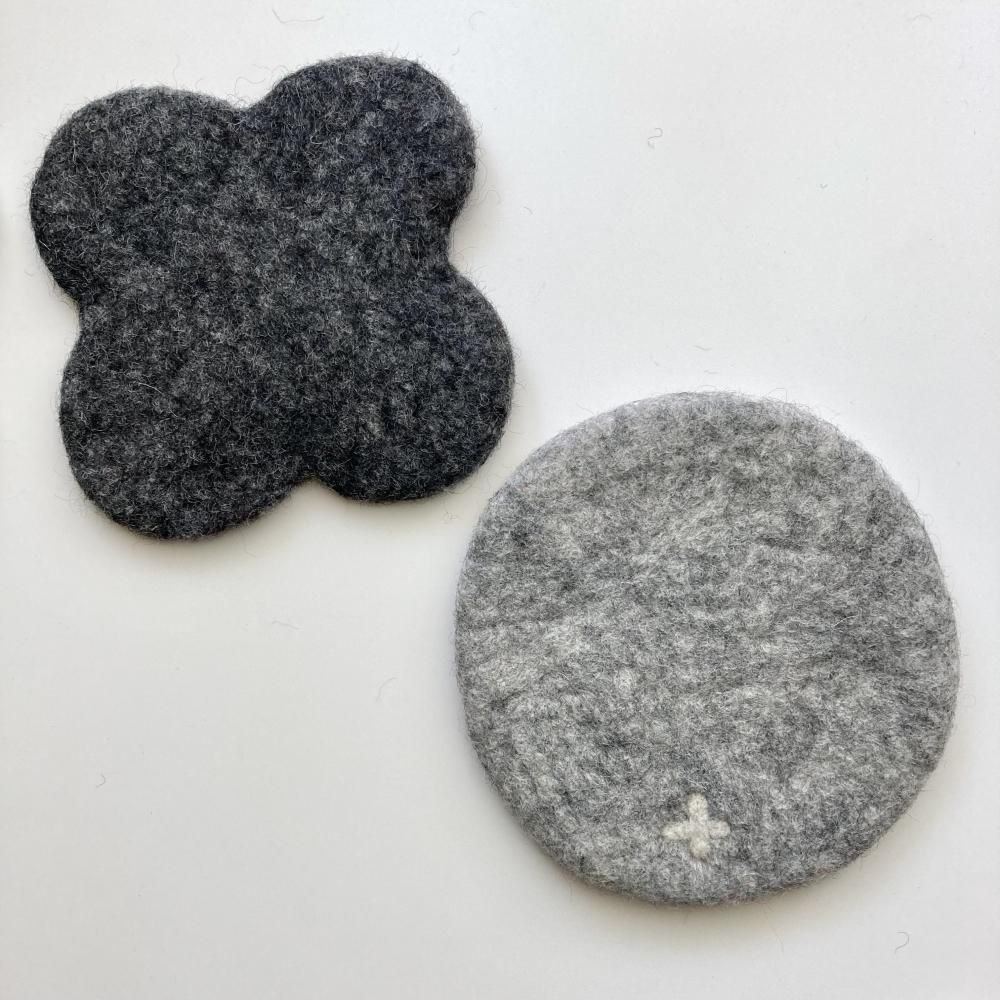 厚みがあり、しっかりとした作りのシンプルな円形のフェルトコースター。+のモチーフがアクセントになっています。