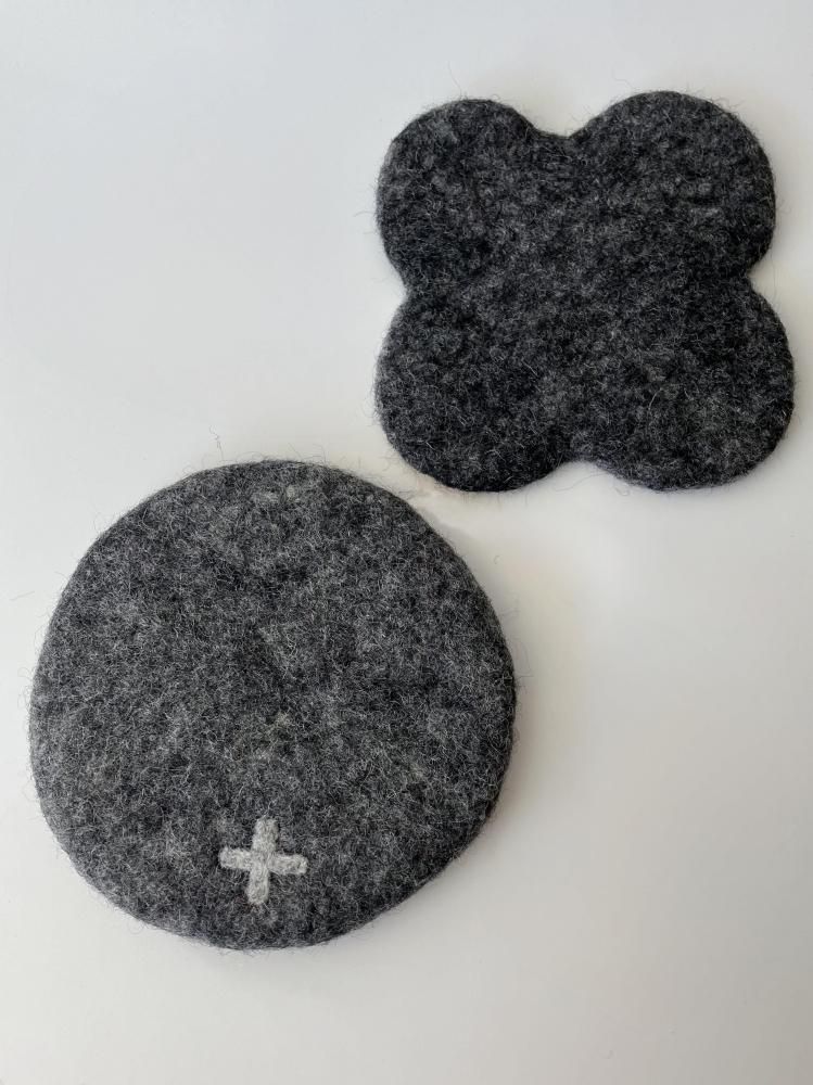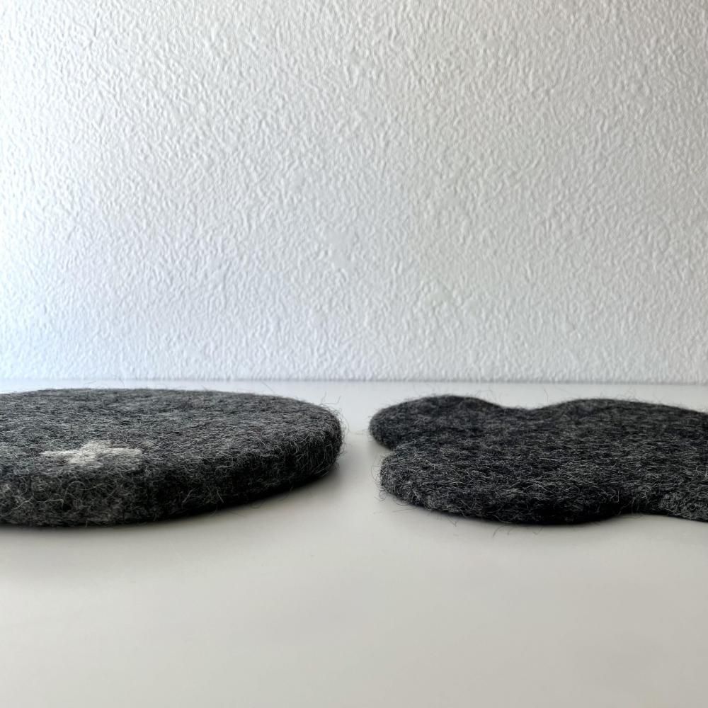 厚みがあり、しっかりとした作りのシンプルな円形のフェルトポットマット。+のモチーフがアクセントになっています。北欧風のシンプルなデザインです。