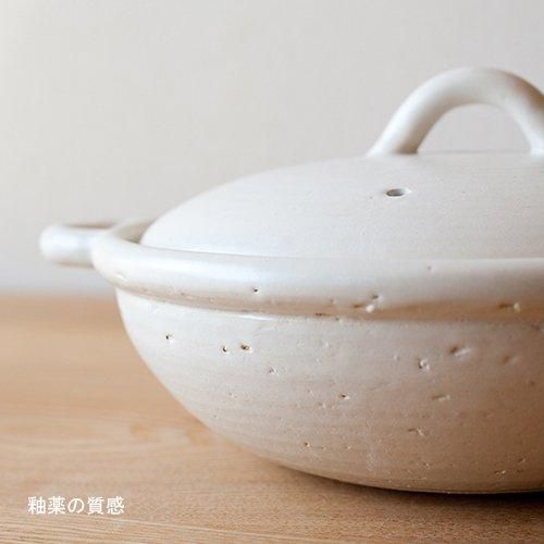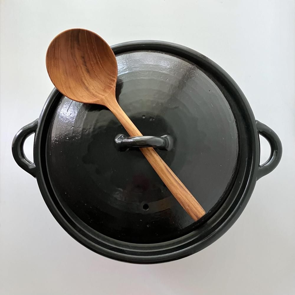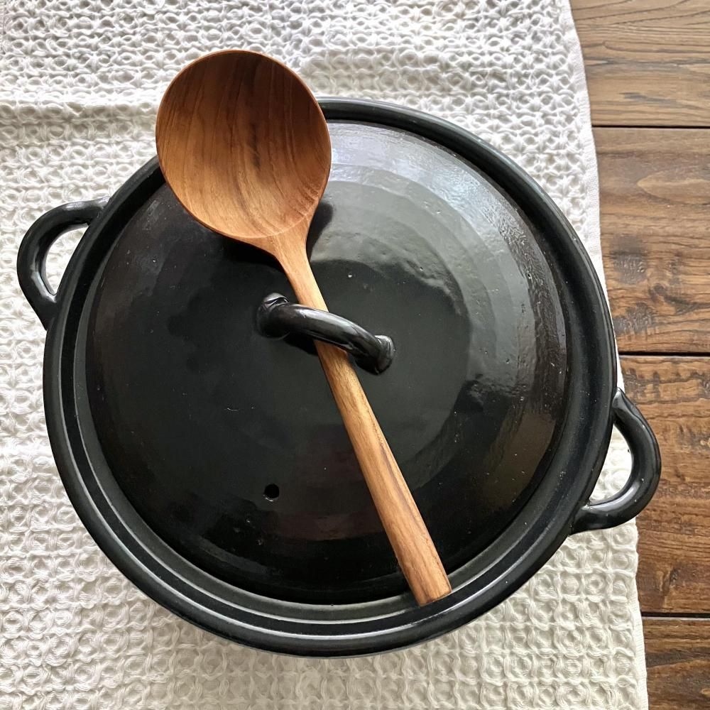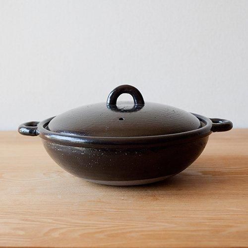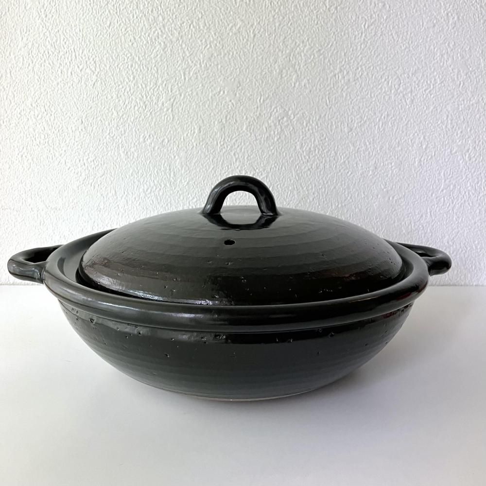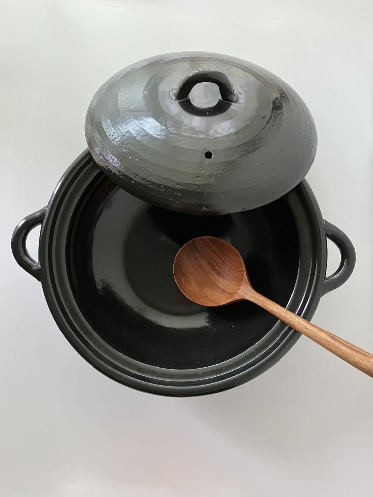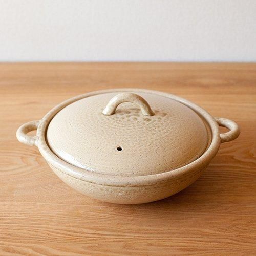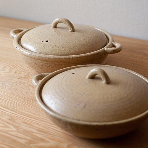 持ち手のフォルムや平たく丸い形がモダンでありながら、どこか懐かしい雰囲気も感じさせる、シンプルなデザインの土鍋です。
