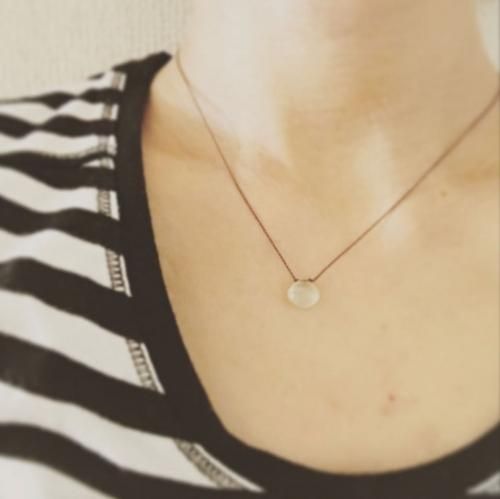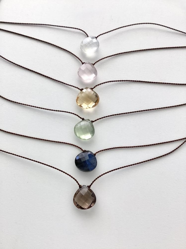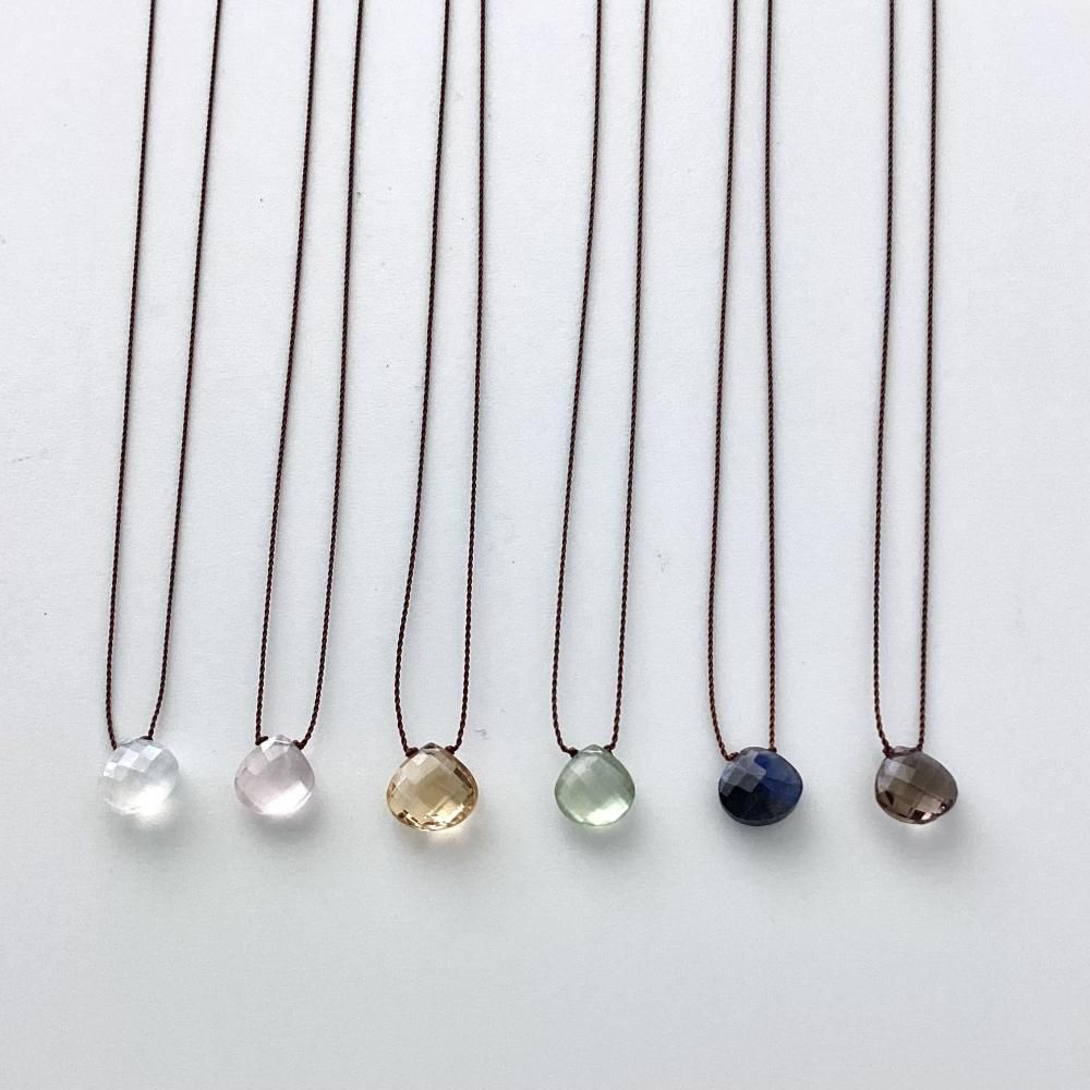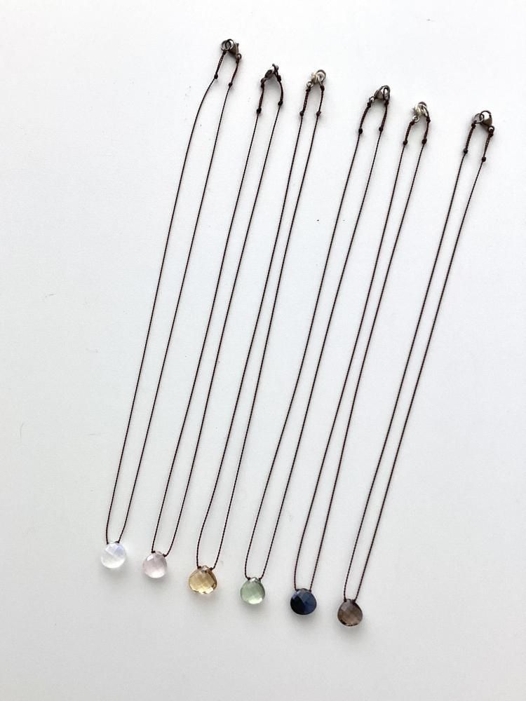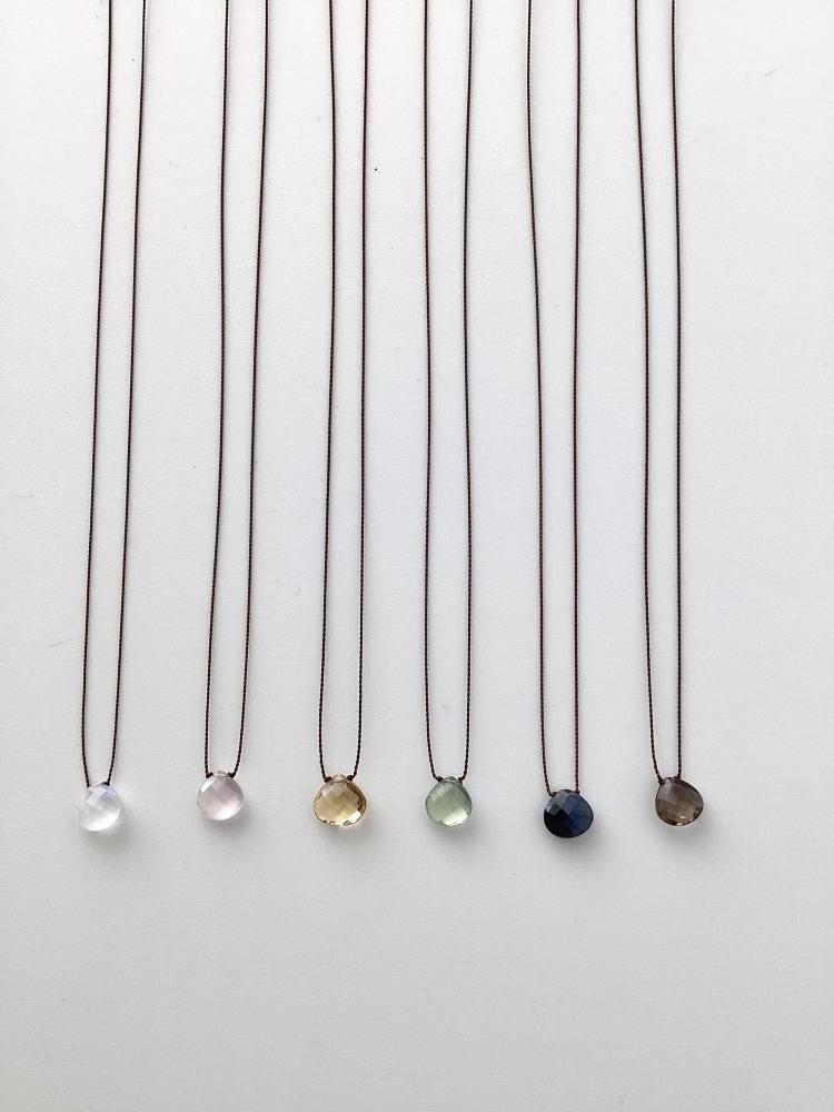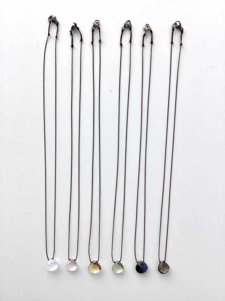 チェッカー模様にカットされた天然石が太陽の光を強く反射させることで、美しい色彩を感じられます。紐で結び、極めてシンプルに仕上げることによって、石本来の美しさを最大限に表現したネックレスです。